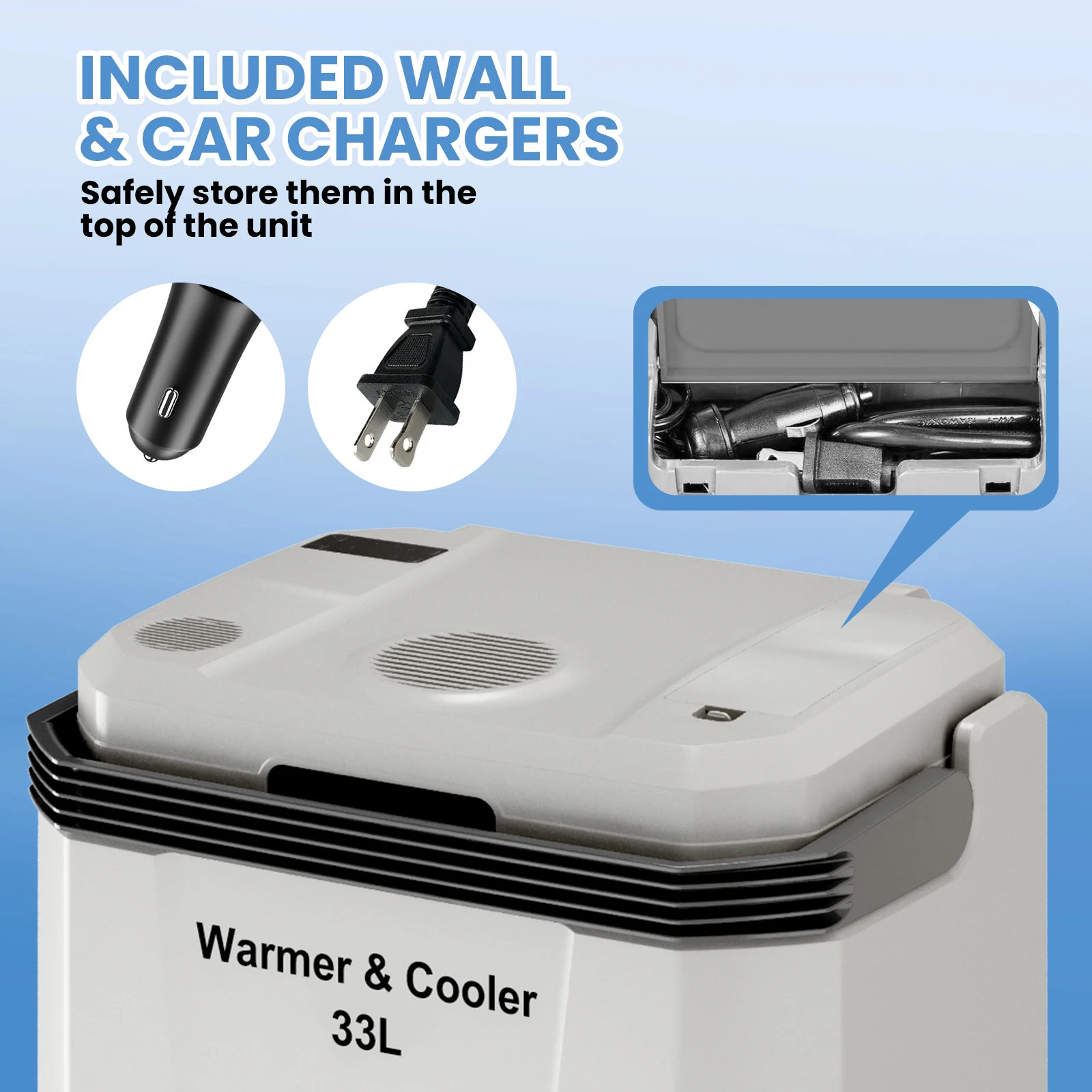 33-L Iterior Comomparttment: The electric cooler interior is spacious enough to fit numerous bottles, food containers, utensils, to-go meals, refrigerated medications, and even 2-liter soda bottles! The easy-clean design allows for quick wipe-downs with minimal maintenance.