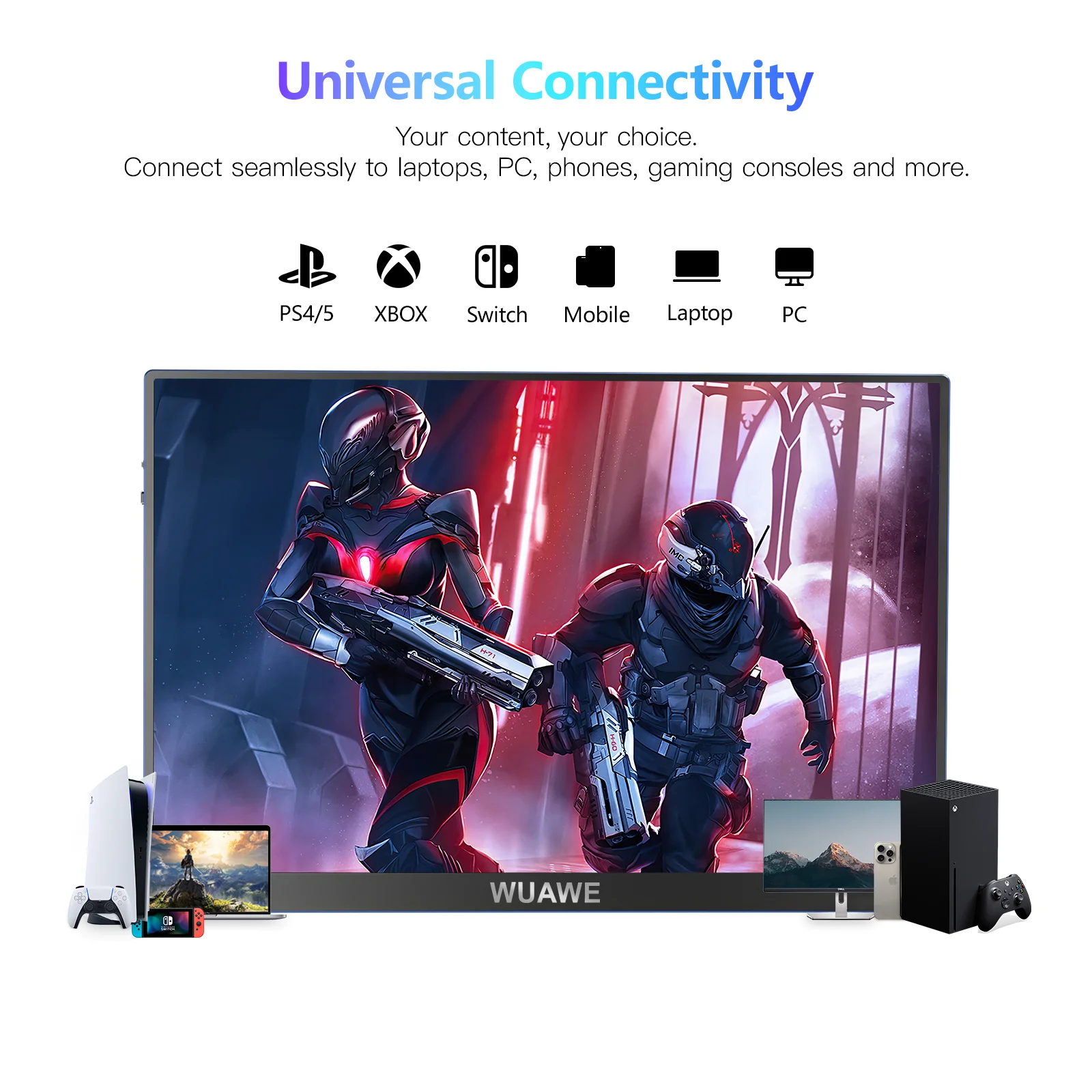 🌈 Plug and Play External Monitor: WUAWE portable screen just got even more convenient with plug-and-play functionality. Simply connect to power and display signal transmission using a USB Type-C cable – no drivers needed. With 2 full-featured Type-C ports and a mini HDMI port, easily connect to your laptop💻, PC🖥️, cell phone📱, Macbook, PS5/PS4🎮, Xbox, and Switch for seamless connectivity on-the-go. (⚡Note: Thunderbolt 3.0 or USB 3.1 Type C DP ALT-MODE required for compatibility)
