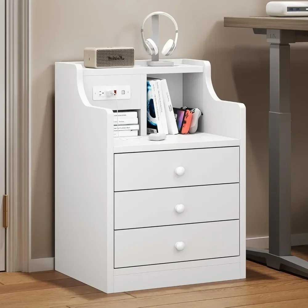Nightstand with Charging Station, Night Stand with 3 Storage Drawers, Bedside Table with Hutch, Modern End Side Table for